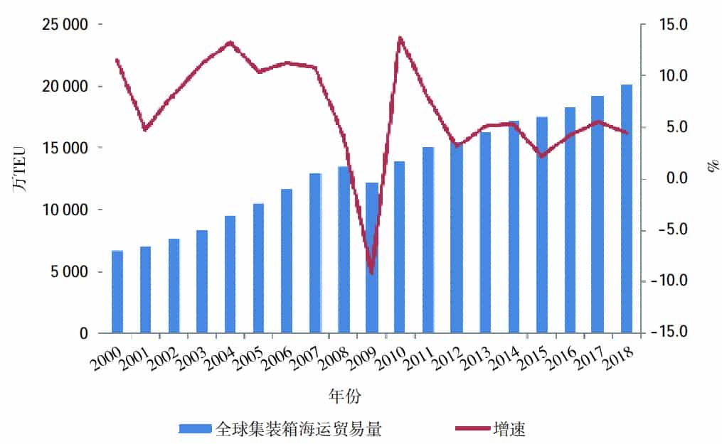 2018年全球集裝箱海運(yùn)貿(mào)易出現(xiàn)小幅下滑,全年集裝箱海運(yùn)量為2.01億TEU,年度增速降至4.5%,較2017年下降一個(gè)百分點(diǎn)。