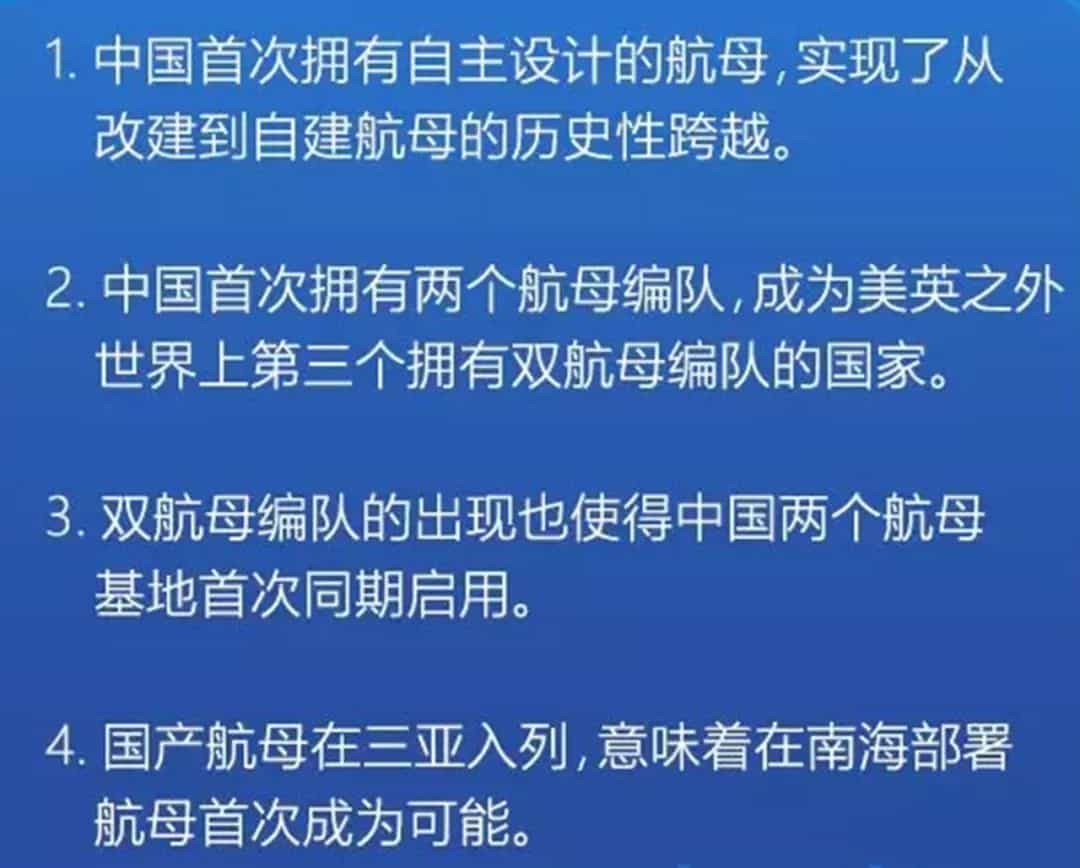 首艘國產(chǎn)航母的入列,標(biāo)志著中國正式進(jìn)入“雙航母時代”,創(chuàng)造了四個“首次”,讓人驕傲和鼓舞。