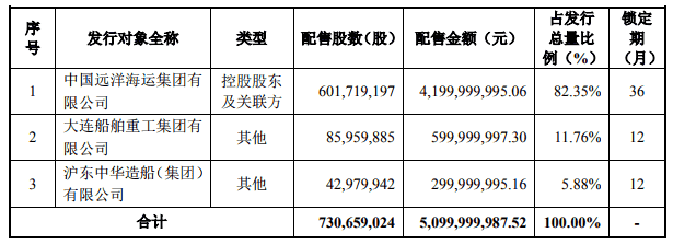 3月18日晚間,中遠海能發(fā)布公告稱,已經向中遠海運集團、大船集團和滬東中華三家發(fā)行對象非公開發(fā)行股票7.3億股,募集資金總額約為51億元。