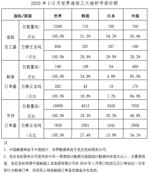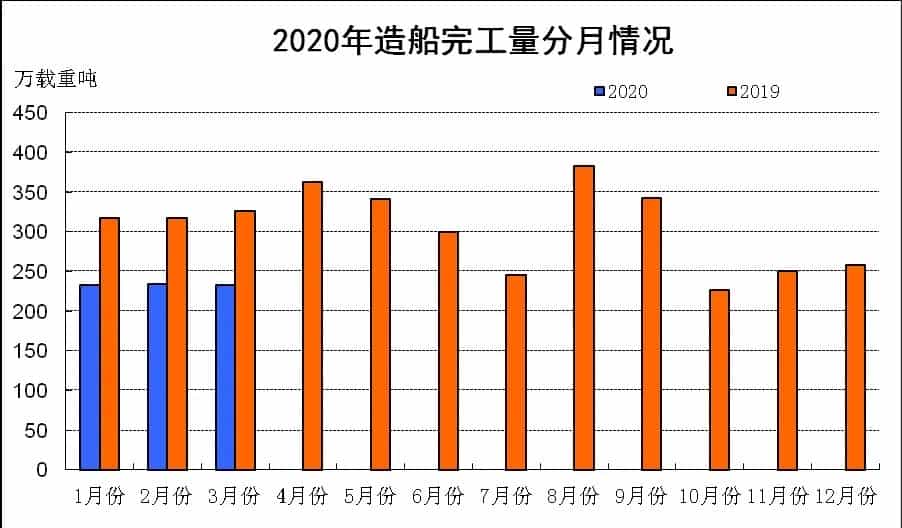 2020年1~3月份,受全球新冠肺炎疫情蔓延的影響,國際航運市場持續(xù)低迷。我國造船完工量和手持船舶訂單量同比下降,受去年同期基數(shù)較低的影響,我國新承接船舶訂單小幅增長。重點監(jiān)測企業(yè)工業(yè)總產(chǎn)值等主要經(jīng)濟指標(biāo)持續(xù)下降。