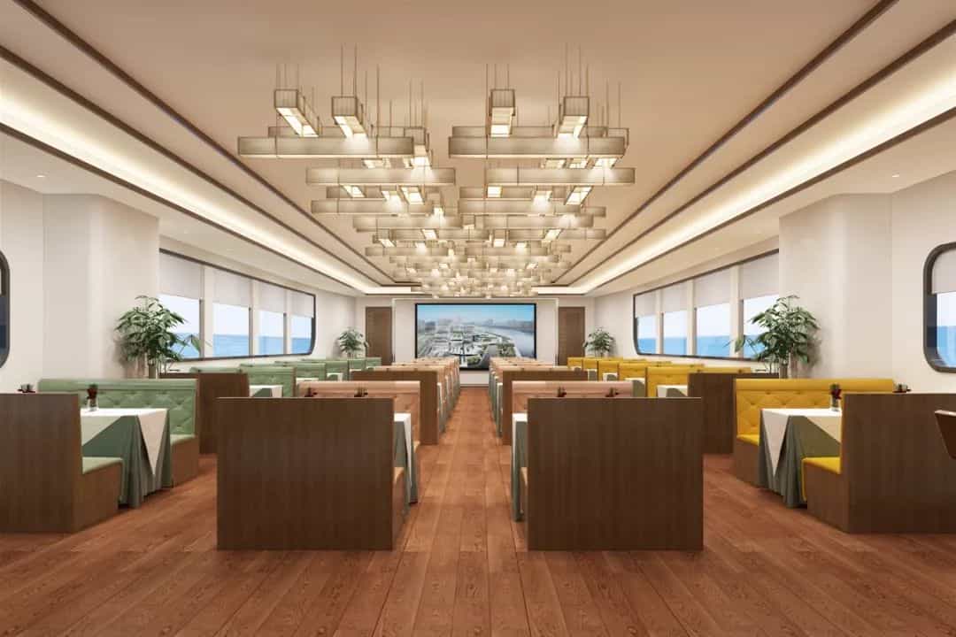 作為首批由國家交通部海事局正式批復(fù)并通過中國船級社CCS認(rèn)證的純電池動力游船,486客位純電動客船采用現(xiàn)代豪華游船的創(chuàng)新設(shè)計(jì)理念,滿足觀光游覽、接待、商務(wù)、慶典等綜合功能。該船主體為全鋼質(zhì)雙體焊接結(jié)構(gòu),采用全通透設(shè)計(jì),設(shè)兩層甲板,整船總長42.5m,型寬12.5m,型深3.3m,為全電力全回轉(zhuǎn)對轉(zhuǎn)舵槳雙機(jī)推進(jìn),航速10.0kn,建成后將躋身全國示范式純電動游船行列,成為珠江夜游的又一極具代表性的名片!