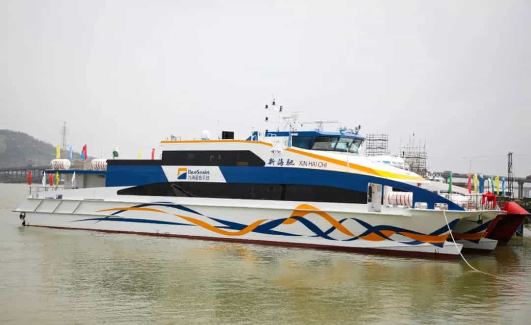 “新海馳”號(hào)是繼“新海威”號(hào)、“新海亮”號(hào)后,澳龍船艇與珠海九洲藍(lán)色干線的再度攜手,該船采用全鋁合金材料,總長(zhǎng)42.1米,型寬10.6米,設(shè)計(jì)航速36節(jié),客位數(shù)238人。采用了澳大利亞Austal全球領(lǐng)先的設(shè)計(jì)和工藝,在“新海威”號(hào)的基礎(chǔ)上,根據(jù)海上水域特點(diǎn)與客戶需求進(jìn)行深度優(yōu)化,達(dá)到更舒適性、經(jīng)濟(jì)性、安全性的最優(yōu)平衡。