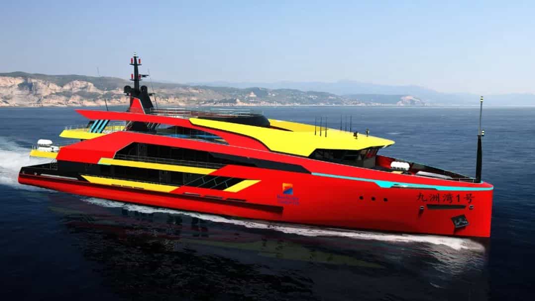 “九洲灣1號(hào)”被譽(yù)為國(guó)內(nèi)首艘近海情境主題式迷你郵輪,該船總長(zhǎng)62米,型寬11.6米,設(shè)計(jì)航速17節(jié),客位數(shù)398人。其設(shè)計(jì)理念定位為“海上移動(dòng)美學(xué)平臺(tái)”。外觀采用紅、黃、黑為主色調(diào),形象酷似中國(guó)古代神話人物—“哪吒”,并融入國(guó)潮文化和科技元素,在設(shè)計(jì)、建造、信息化等方面實(shí)現(xiàn)全方位提升。