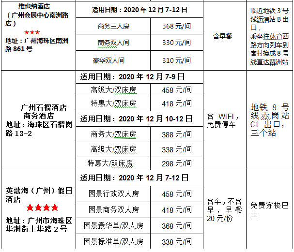 ①由于展會(huì)期間房源緊張,建議盡早預(yù)定,以免出現(xiàn)房?jī)r(jià)提高或沒(méi)有房間的情況;