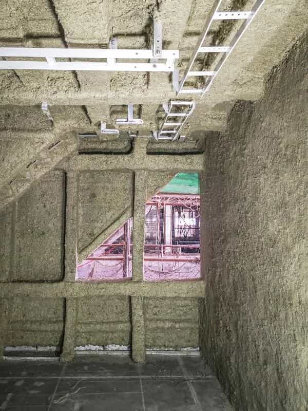 上圖采用SprayMix S超細(xì)耐高溫巖棉與雙組份水基膠粘劑GPA和GPB并經(jīng)專業(yè)設(shè)備噴涂而成。SprayMix S呈灰綠色,名義密度140kg/m3,熔點(diǎn)1200℃。絕熱系數(shù)為0.038 W/m℃,30mm平均隔聲量為43db。按IMO 2010 FTP PART 1檢測(cè),SprayMix S為不燃材料。按IMO 2010 FTP Part 3規(guī)則檢測(cè),噴涂SprayMix S的耐火艙壁、耐火甲板達(dá)到A-60耐火等級(jí),對(duì)鋼制結(jié)構(gòu)與鋁合金結(jié)構(gòu)均適用。