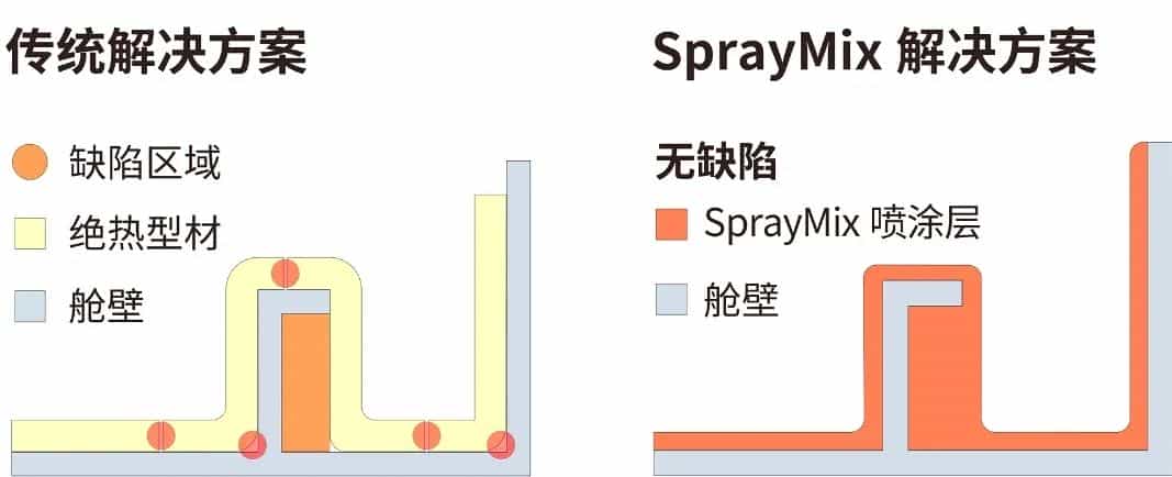 SprayMix噴涂層可與基體緊密粘接,形成一個(gè)密閉整體,無(wú)接縫,無(wú)空洞,可有效阻斷冷熱橋和聲橋,大大提高了絕熱性能與吸音降噪性能。同時(shí),產(chǎn)品克服了傳統(tǒng)保溫型材接縫處、基底鋼板與保溫材料空隙的冷凝結(jié)露問題。