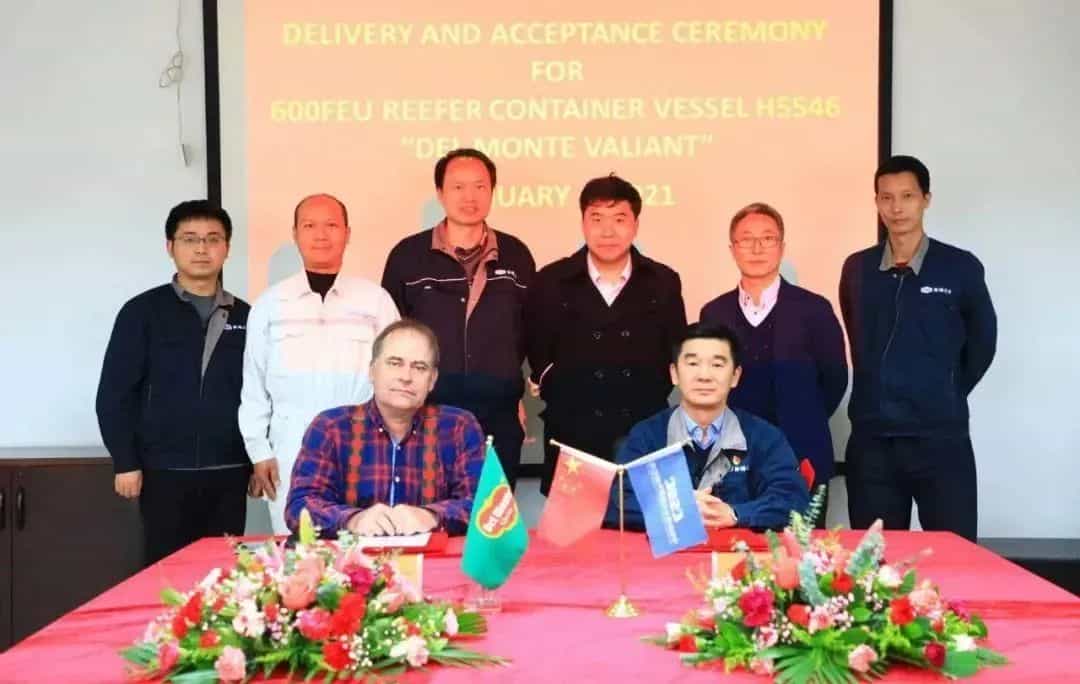 下午,黃埔文沖交付為美國DEL MONTE 公司建造的600FEU全冷箱集裝箱5#船(H5546)“DEL MONTE VALIANT”輪。