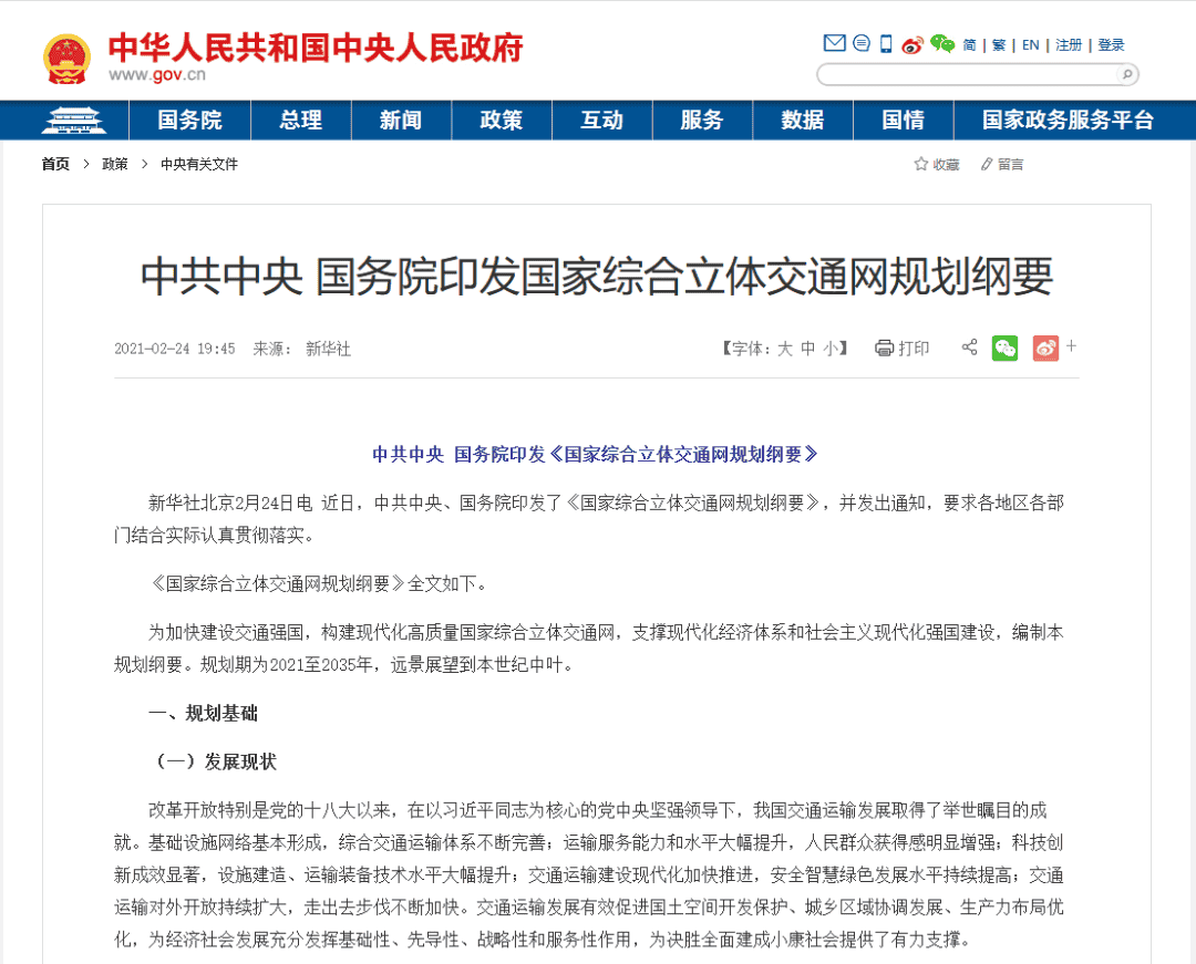 據(jù)新華社2月24日?qǐng)?bào)道,近日,中共中央、國(guó)務(wù)院印發(fā)了《國(guó)家綜合立體交通網(wǎng)規(guī)劃綱要》(簡(jiǎn)稱綱要),提出了從2021年到2035年,我國(guó)構(gòu)建現(xiàn)代化高質(zhì)量國(guó)家綜合立體交通網(wǎng)的遠(yuǎn)景規(guī)劃。