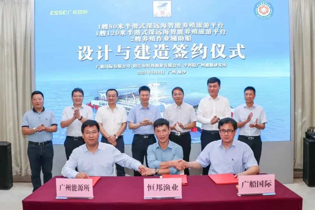 近日,中國(guó)船舶集團(tuán)廣船國(guó)際和陽(yáng)江市恒邦漁業(yè)有限公司簽訂1艘80米半潛式深遠(yuǎn)海智能養(yǎng)殖旅游平臺(tái)建造合同,該平臺(tái)建成后將是廣東省首個(gè)大型半潛式養(yǎng)殖旅游綜合平臺(tái)。儀式還同時(shí)簽訂了1艘120米半潛式深遠(yuǎn)海智能養(yǎng)殖旅游平臺(tái)和2艘養(yǎng)殖作業(yè)輔助船合作意向書。