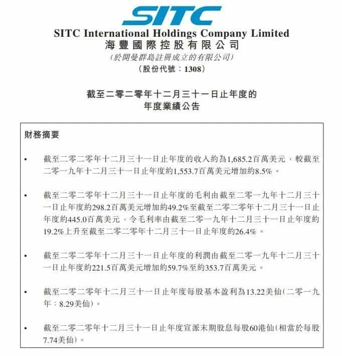 海豐國際公布的2020年業(yè)績報告顯示,全年共實現(xiàn)收入16.852億美元,同比增長8.5%。利潤達到3.537億美元,同比增長59.7%。其中,集裝箱航運物流板塊收入為16.62億美元,同比增長約8.9%。海豐國際表示,集裝箱航運物流板塊業(yè)績增長,主要由于貨運量增加及平均運費的提升。2020年,該公司集裝箱貨運量為2,614,203個標準箱,同比增長5.3%。平均運費(不包括互換倉位費收入)達到545.1美元/標準箱,同比增長約1.6%。