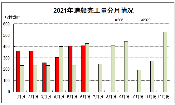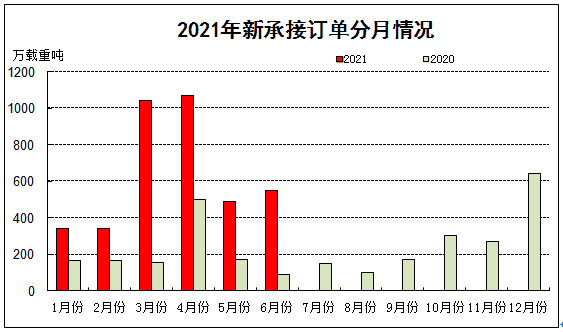2021年上半年,全國造船完工量2092萬載重噸,同比增長19.0%;承接新船訂單量3824萬載重噸,同比增長206.8%。截至6月底,手持船舶訂單量8660萬載重噸,同比增長13.1%,比2020年底手持訂單增長21.8%。