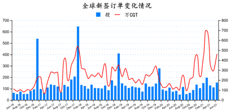 2021年6月份全球新簽訂單153艘,從船型上來看,散貨船16艘,共計(jì)1135800載重噸;油船10艘,共計(jì)1464000載重噸;集裝箱船70艘,共計(jì)583706標(biāo)箱;化學(xué)品船27艘,共計(jì)1181550載重噸;液化氣船14艘,共計(jì)1218000立方米;其他船型10艘,共計(jì)263344CGT;海工船6艘,共計(jì)81260CGT。