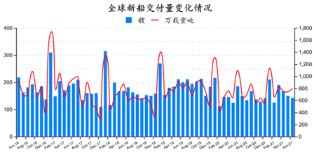 從船型來看,散貨船的交付數(shù)量為43艘,共計(jì)3977285載重噸;集裝箱船的交付數(shù)量為12艘,共計(jì)103446TEU;油船的交付數(shù)量為12艘,共計(jì)1773575載重噸;化學(xué)品船的交付數(shù)量為14艘,共計(jì)433740載重噸;液化氣船交付數(shù)量為8艘,共計(jì)882400立方米;海工船交付數(shù)量為31艘,共計(jì)82032載重噸;其他船型交付數(shù)量為22艘,共計(jì)139894載重噸。