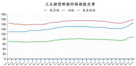 數(shù)據(jù)顯示,6月份散貨船、油船和集裝箱船新船價(jià)格指數(shù)分別上升4點(diǎn)、2點(diǎn)和2點(diǎn)至146點(diǎn)、159點(diǎn)和90點(diǎn)。