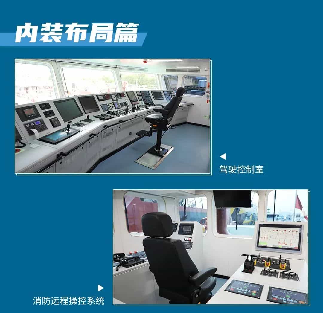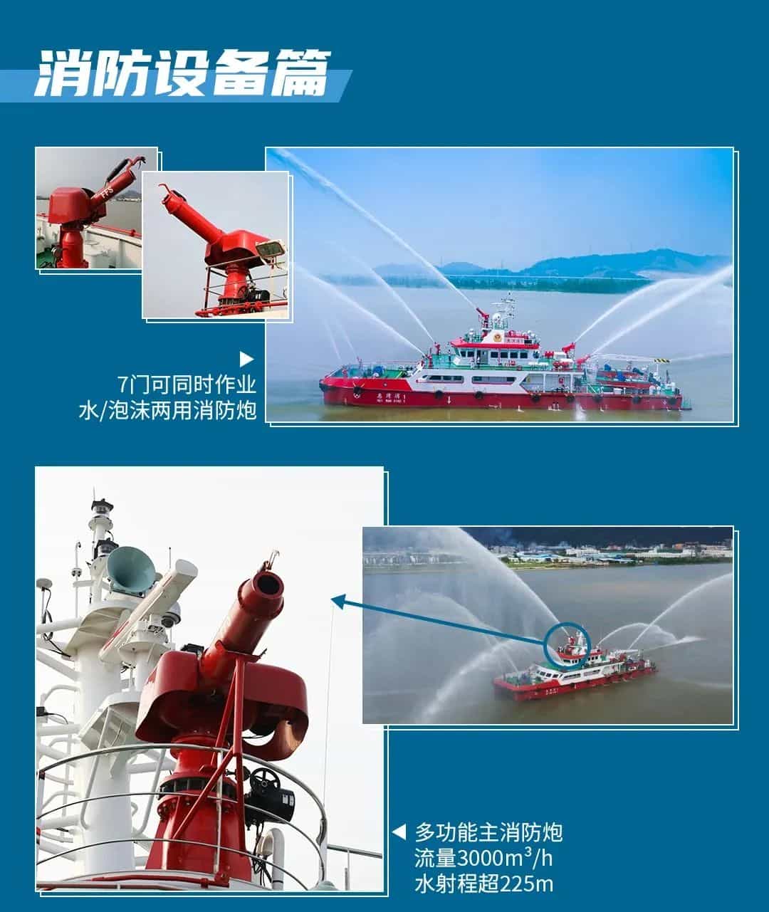 據(jù)悉,該船艏部采用DP1定位系統(tǒng),尾部采用全回轉(zhuǎn)系統(tǒng)的消防作戰(zhàn)船艇,既可在海上定位,也可進(jìn)行360度回轉(zhuǎn),提升了整船的機(jī)動(dòng)性與靈活性。此外,該船是中國海事局新法規(guī)(對(duì)防火作新的要求)頒布后建造的新型消防船,主船體與上建均采用鋼質(zhì)結(jié)構(gòu),加大了型深與結(jié)構(gòu)強(qiáng)度。尾部兩艘采用柴油燃料推進(jìn)的鋁合金工作艇,引入國外知名品牌柴油掛機(jī),操作性能更為優(yōu)異.