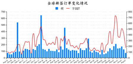 最新全球造船月報出爐,根據(jù)克拉克森最新數(shù)據(jù)統(tǒng)計(截至2021年9月10日),2021年8月份全球新簽訂單74艘,共計1797745CGT。