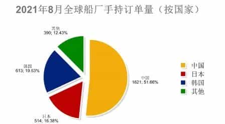 按接單船廠國家來看,8月份全球新船訂單74艘,合計1797745CGT,其中中國船廠接獲42艘,合計783391CGT;日本船廠接獲7艘,合計194735CGT;韓國船廠接獲16艘,合計778834CGT。修正總噸分別占全球新船訂單量的43.58%、10.83%和43.32%。