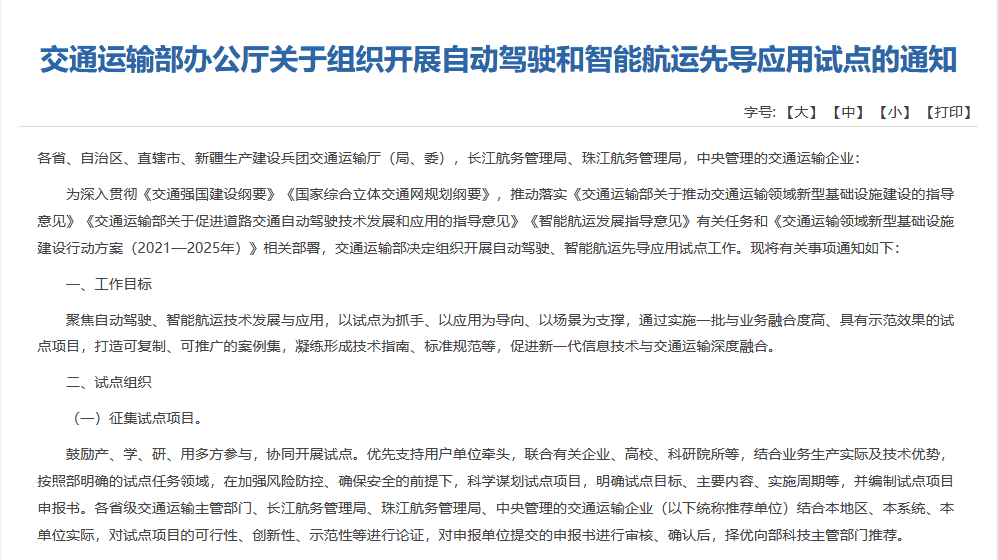 日前,交通運輸部發(fā)布關(guān)于組織開展自動駕駛和智能航運先導(dǎo)應(yīng)用試點的通知,聚焦自動駕駛、智能航運技術(shù)發(fā)展與應(yīng)用,以試點為抓手、以應(yīng)用為導(dǎo)向、以場景為支撐,通過實施一批具有示范效應(yīng)的試點項目,打造可復(fù)制、可推廣的案例集,凝練形成技術(shù)指南、標(biāo)準(zhǔn)規(guī)范等,促進(jìn)新一代信息技術(shù)與交通運輸深度融合。
