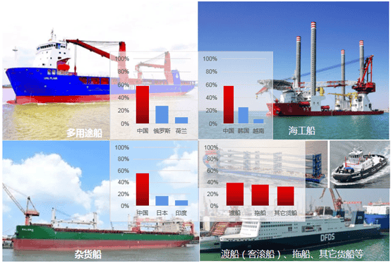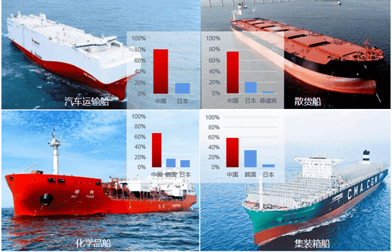 除在總量上繼續(xù)保持領(lǐng)先外,中國(guó)造船企業(yè)在各細(xì)分船型市場(chǎng)上持續(xù)發(fā)力,18個(gè)主要船型中,中國(guó)獲得10個(gè)船型的市場(chǎng)份額第一,其中在集裝箱船、散貨船、化學(xué)品船、多用途船(MPP)、海工船、汽車運(yùn)輸船(PCC/PCTC)等船型的市場(chǎng)份額超過(guò)50%(絕對(duì)優(yōu)勢(shì)),產(chǎn)品結(jié)構(gòu)大幅優(yōu)化,高技術(shù)、高附加值主力船型不斷涌現(xiàn)。