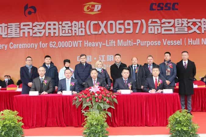 近日,中國船舶集團(tuán)旗下中船澄西船舶修造有限公司2號(hào)62000噸重吊多用途船“赫貝特(HERBERT)”輪簽字交付。這是目前世界載重噸位最大多用途重吊船,比原計(jì)劃提前42天交付,這也是中船澄西2022年交付的第2艘新造船。