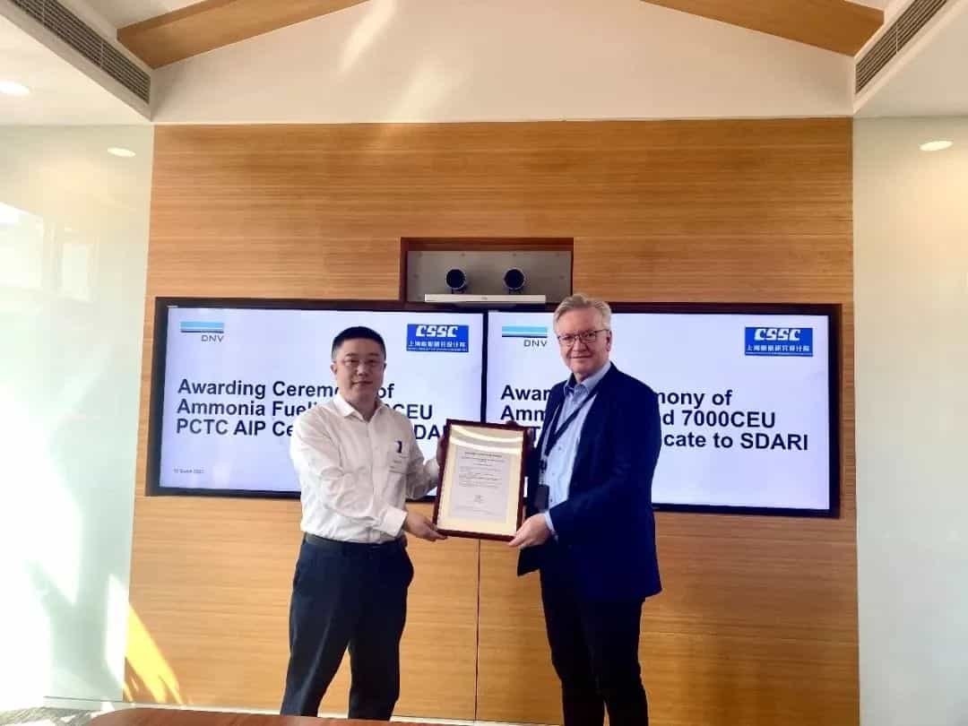 日前,由中國船舶集團有限公司旗下上海船舶研究設(shè)計院自主研發(fā)設(shè)計的中國首創(chuàng)首款氨燃料動力7000車位汽車運輸船(PCTC)正式獲得DNV頒發(fā)的原則性認可(AiP)證書。