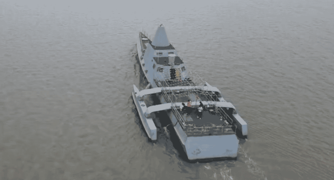 據(jù)介紹,該無(wú)人艇采用三體船型設(shè)計(jì),總長(zhǎng)40余米,排水量約200噸,最大航速20余節(jié),可在5級(jí)海況正常工作,6級(jí)海況安全航行。