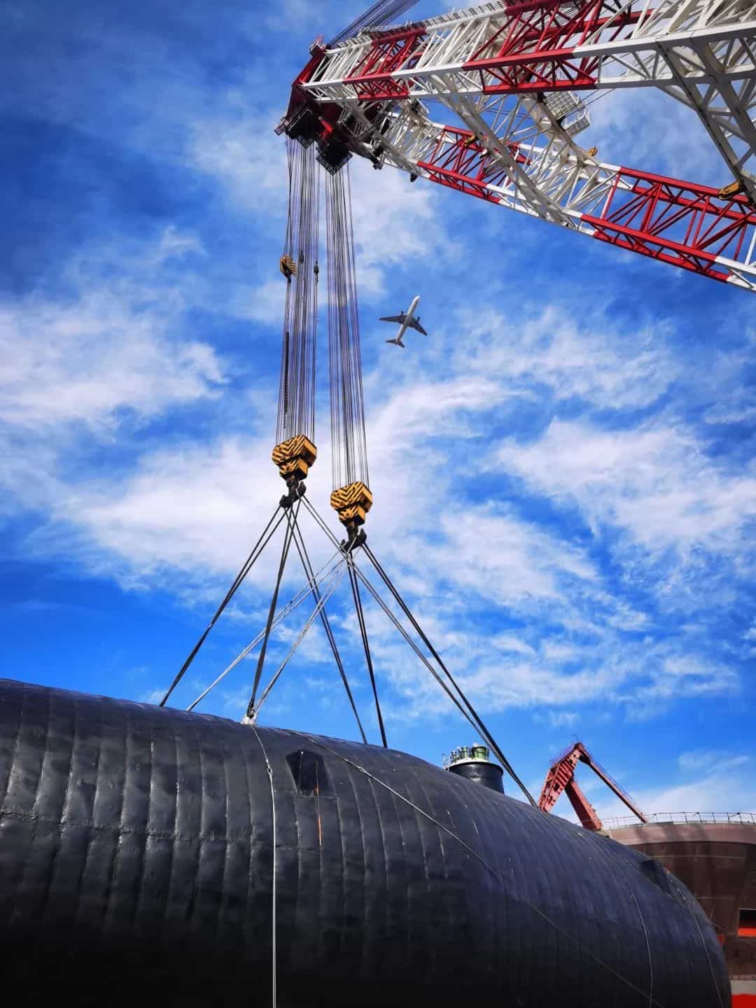 單罐重量臨近浮吊極限重量,尤其是在吊裝處于船艏位置的1號罐時,不規(guī)則形狀使其重心位置偏移。