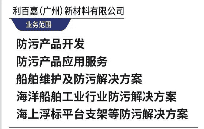 利百嘉(廣州)新材料科技有限公司(簡稱:利百嘉),是領先的海洋防污新材料研發(fā)企業(yè),專注研發(fā)多功能環(huán)保新材料,為海洋環(huán)境保護提供技術服務和產(chǎn)品。