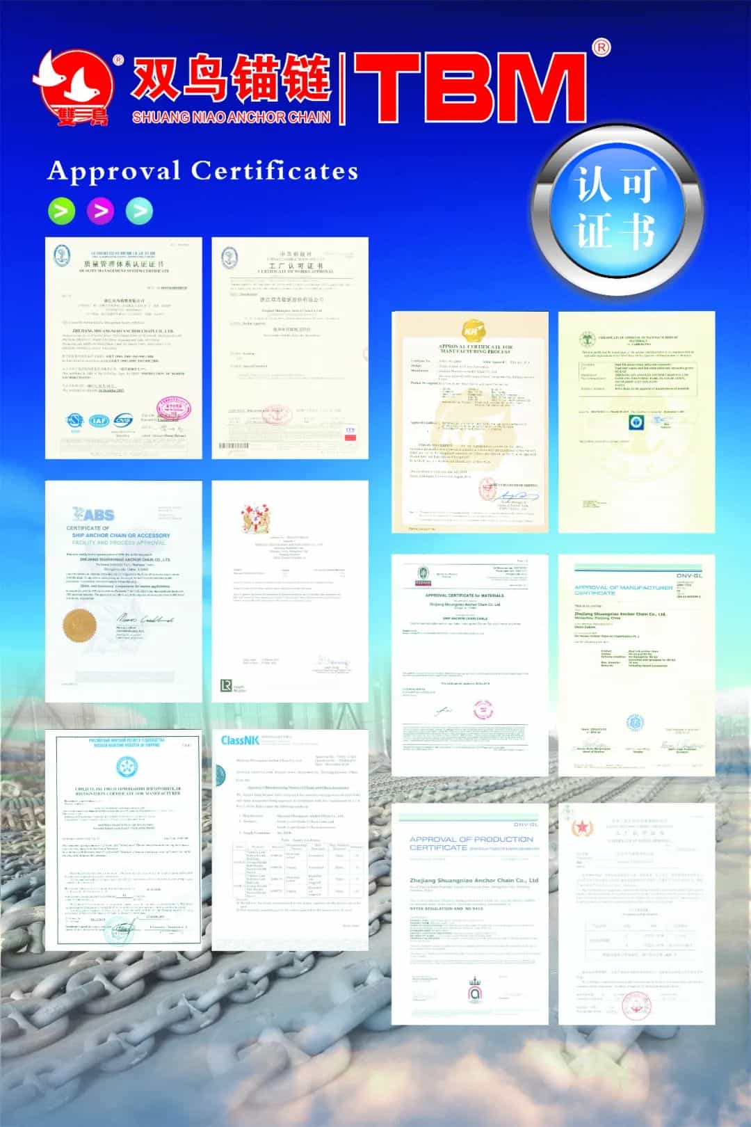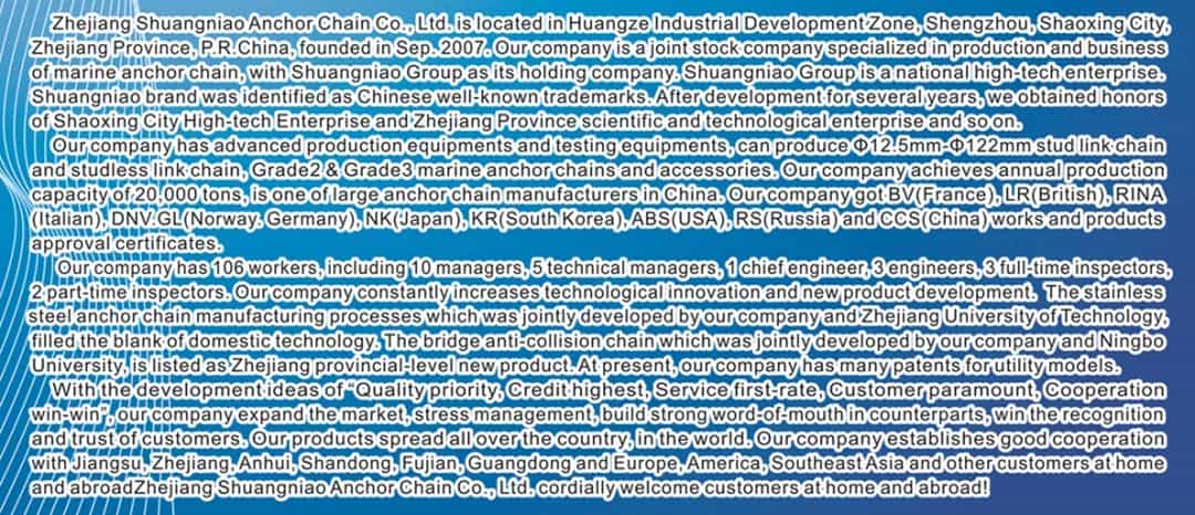 浙江省雙鳥錨鏈股份有限公司(簡稱:雙鳥錨鏈)位于浙江省嵊州市黃澤工業(yè)開發(fā)區(qū),成立于2007年9月,是一家以專業(yè)生產(chǎn)經(jīng)營船用錨鏈為主的股份制企業(yè)。