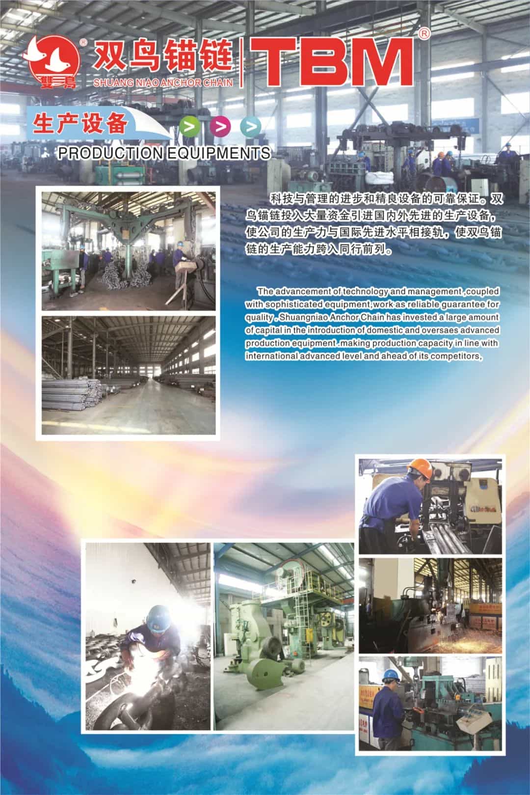 公司擁有先進的生產(chǎn)設備和檢測設備,能生產(chǎn)二、三級船用錨鏈及附件產(chǎn)品,年生產(chǎn)能力20000噸,并擁有與之配套的熱處理和拉力測試設備,能接受各種非標產(chǎn)品定制,滿足不同客戶的需求。