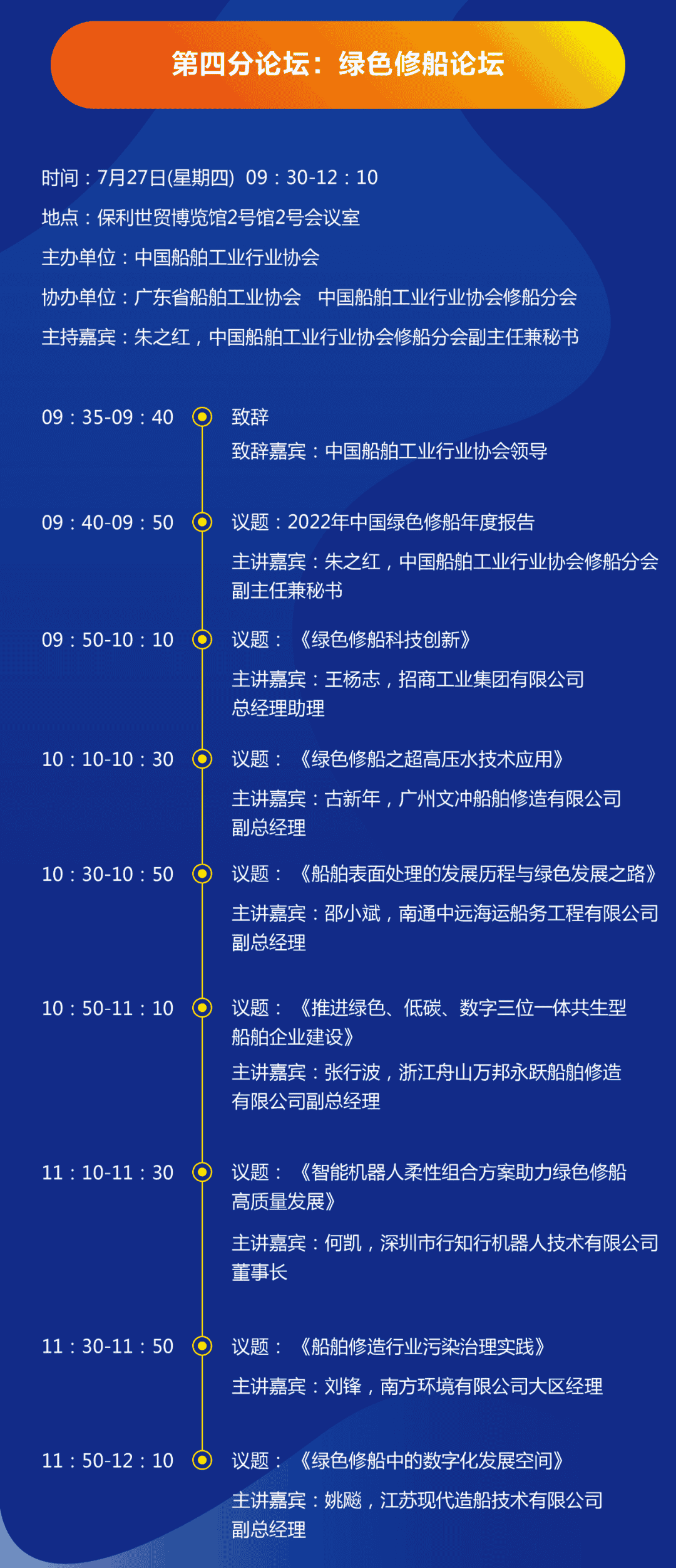 7月27日09:30-12:10 ,“2023第四屆中國(guó)船舶工業(yè)轉(zhuǎn)型升級(jí)高質(zhì)量發(fā)展論壇”第四分論壇--“綠色修船論壇”,將于廣州琶洲保利世貿(mào)博覽館2號(hào)館2號(hào)會(huì)議室召開。