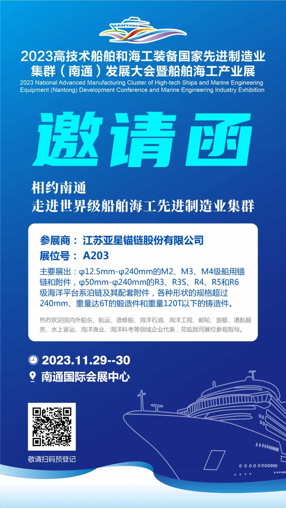 2023年11月29-30日,南通國(guó)際會(huì)展中心A203展位,亞星錨鏈與全球船舶人相約南通,走進(jìn)世界級(jí)船舶海工先進(jìn)制造業(yè)集群!