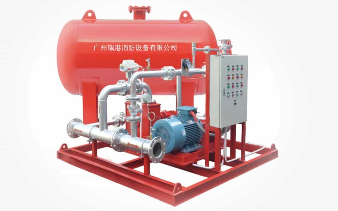 消防壓力水流經該設備時,比例混含器將其按比例分流,其中一小部分水進入泡沫液儲罐夾層擠壓膠囊,置換出泡沫液與消防水在比例混合器內混合形成相應比例的泡沫混合液,并輸送給泡沫噴射裝置,直接向火災保護區(qū)進行滅火工作。