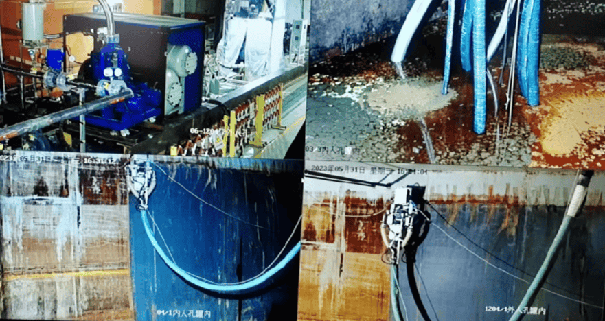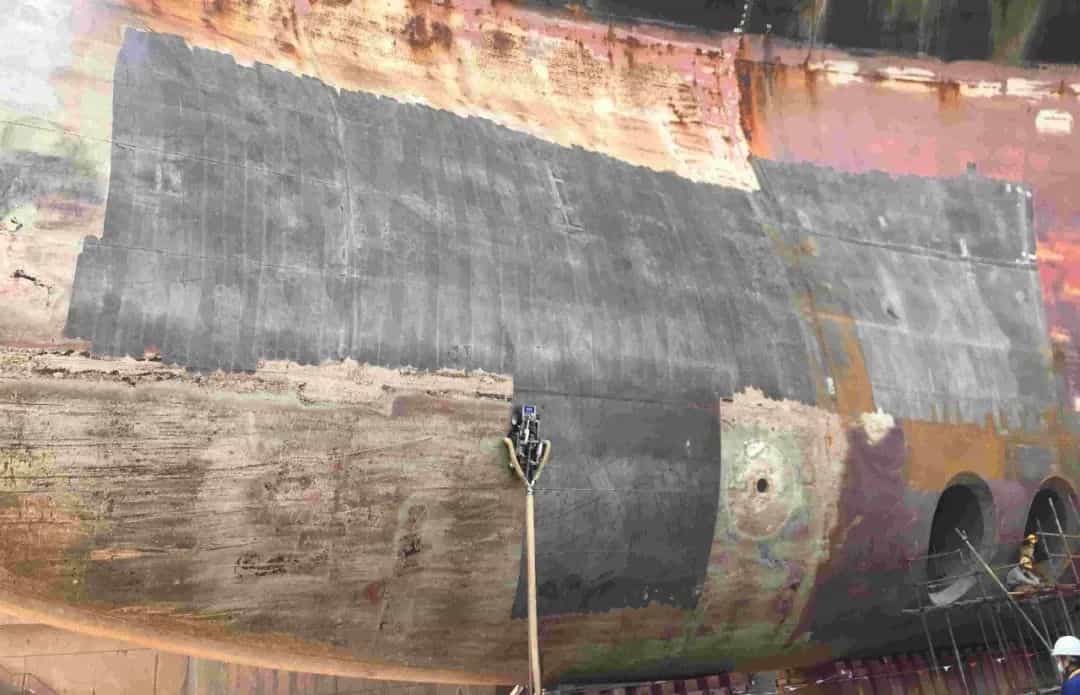 ②超高壓水除銹,環(huán)保高效,沒有粉塵,沒有垃圾散落,看不見水,鋼板見白,恢復Sa2.5級白度;