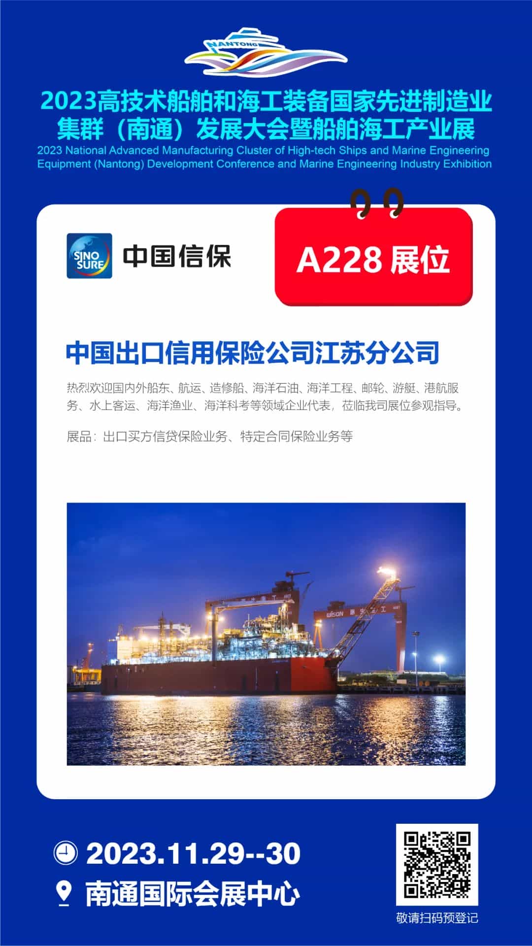2023年11月29-30日,歡迎船舶人蒞臨南通國際會(huì)展中心A228展位,與中國信保攜手合作,逐夢海洋!