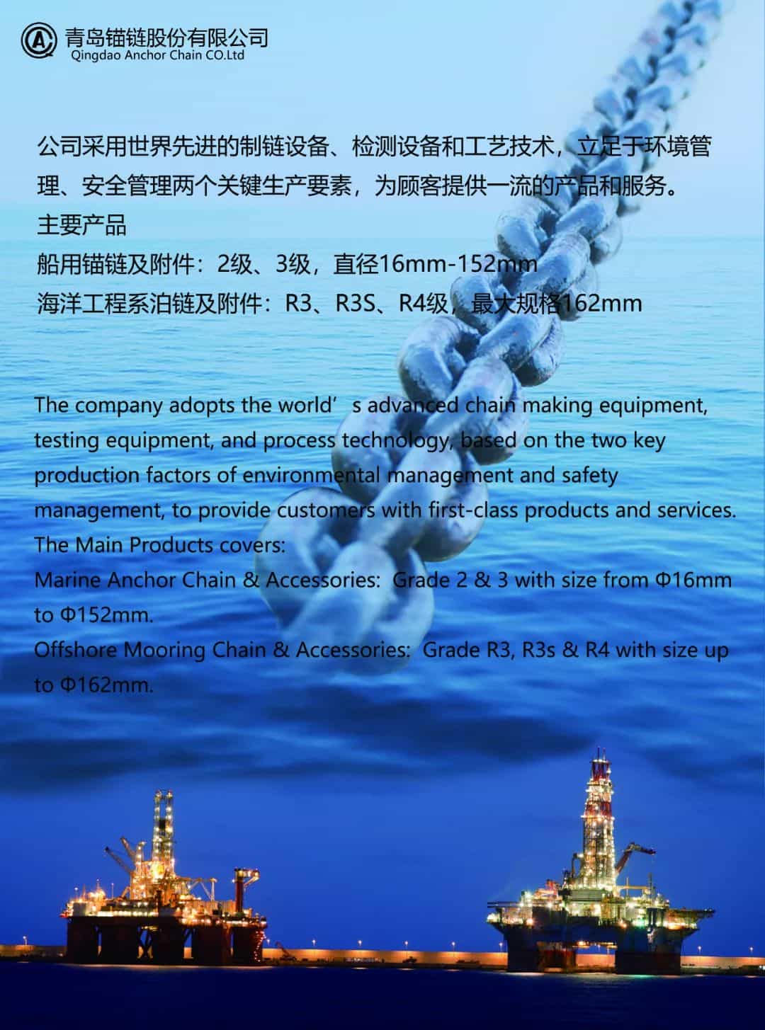 青島錨鏈股份有限公司(簡稱“青島錨鏈”,展位號1B60)始建于1958年,經(jīng)過半個多世紀(jì)的不懈努力,現(xiàn)已發(fā)展成為生產(chǎn)船用錨鏈和海洋工程系泊鏈的世界著名專業(yè)公司。