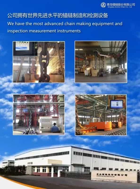 公司采用世界先進的制鏈設(shè)備、檢測設(shè)備和工藝技術(shù),按照ISO1704國際標(biāo)準(zhǔn)和GB/T549-2017、GB/T20848-2017國家標(biāo)準(zhǔn)以及各船級社規(guī)范生產(chǎn) ø16mm - ø152mm 各種規(guī)格的2級、3級船用錨鏈及附件和R3、R3S、R4級海洋工程系泊鏈及附件,也可按客戶要求生產(chǎn)各種非標(biāo)準(zhǔn)鏈條和附件。
