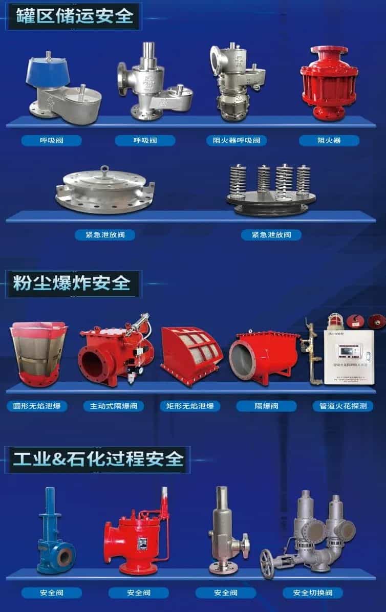 公司致力于壓力容器、鍋爐、常壓儲罐及壓力管道的保護研究,專業(yè)生產(chǎn)各類安全閥、呼吸閥、阻火器、緊急泄放閥、粉塵背壓隔爆閥、無火焰泄爆裝置、粉塵泄爆閥、火花探測熄滅裝置等工業(yè)爆炸及防護控爆產(chǎn)品。