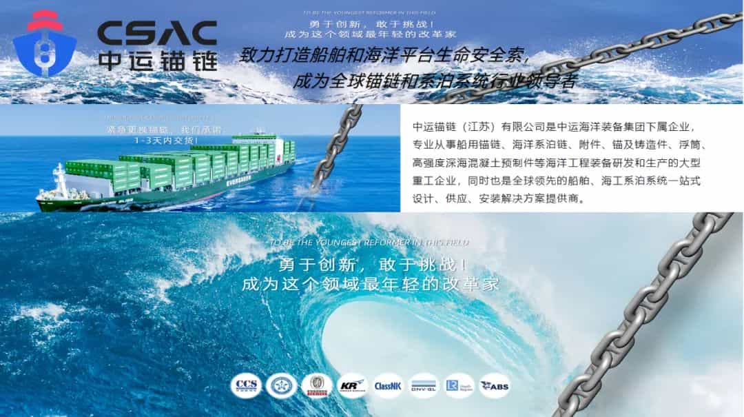 中運(yùn)錨鏈(江蘇)有限公司(簡(jiǎn)稱(chēng):中運(yùn)錨鏈)是全球領(lǐng)先的一站式船用錨鏈及海洋工程系泊鏈制造及解決方案供應(yīng)商。
