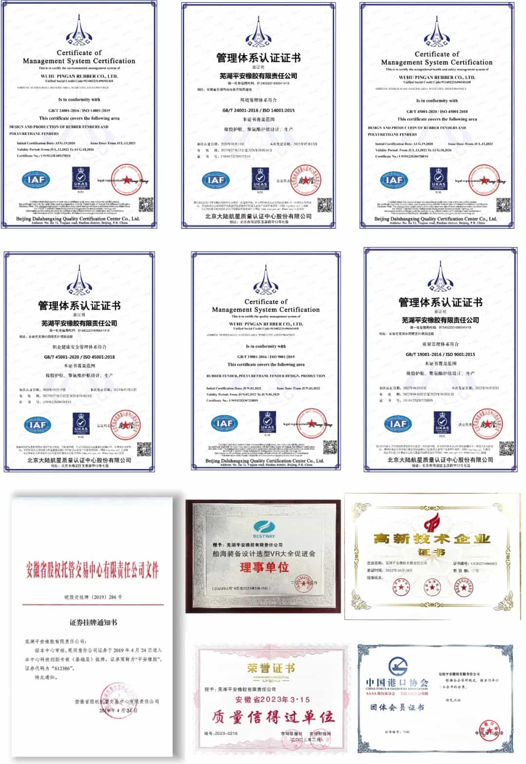 由研發(fā)部門設(shè)計的多款專利產(chǎn)品,如仿輪胎橡膠護(hù)舷、?;疑鹉z護(hù)舷,受到客戶一致好評。公司已通過ISO9001、ISO14001和OHSAS18001質(zhì)量管理體系認(rèn)證,產(chǎn)品已獲得CCS、SGS檢驗(yàn)認(rèn)可,可提供CCS、 LR、BV船檢證書及軍檢證書。