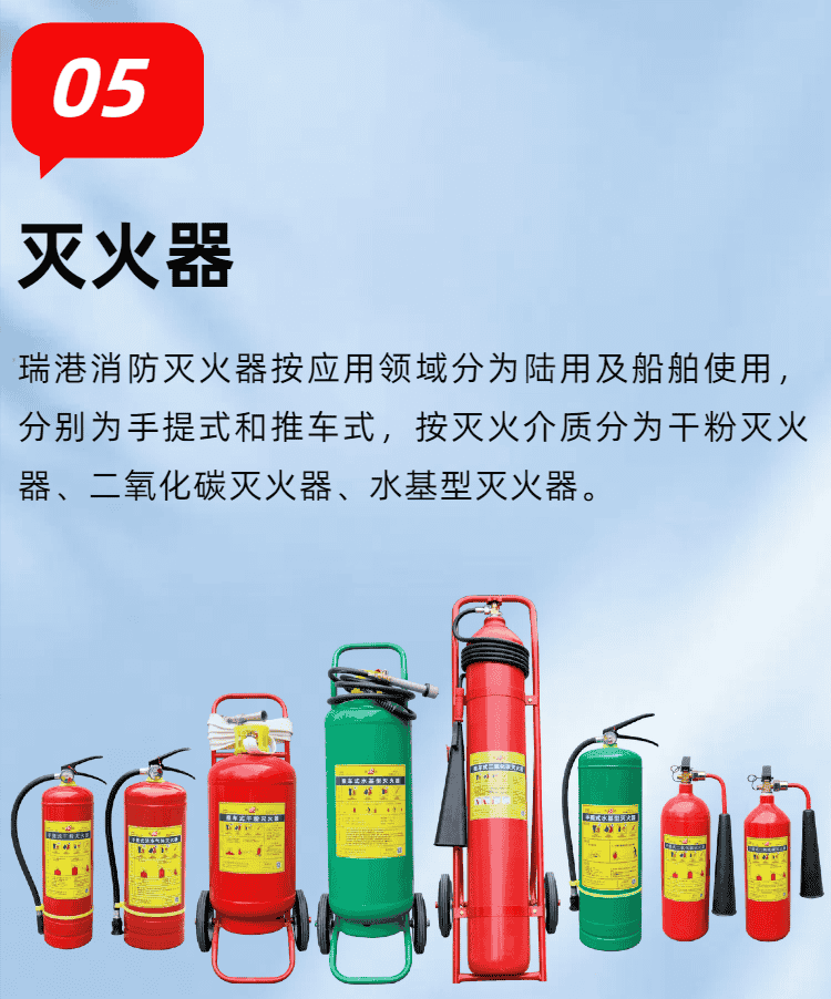 瑞港消防產(chǎn)品有氣體滅火設(shè)備、泡沫滅火設(shè)備、干粉滅火設(shè)備、細(xì)水霧滅火設(shè)備、船用消防設(shè)備、電化學(xué)儲(chǔ)能消防設(shè)備等,高效滅火、智能操控、綠色環(huán)保是產(chǎn)品的亮點(diǎn)所在。