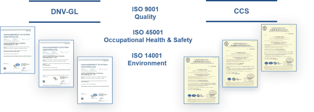 公司已獲得DNV-GL和CCS的ISO9001/ISO14001/ ISO45001/ISO50001雙體系認證,以及EN1090、EN3834等國際認證,是華南地區(qū)規(guī)模最大的船舶修造及鋼結(jié)構(gòu)加工制造企業(yè)之一。