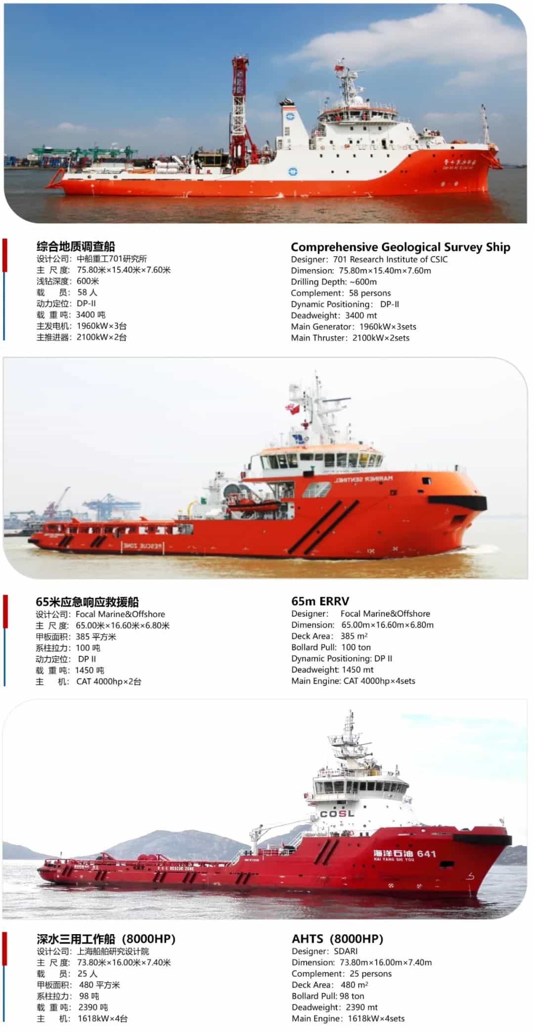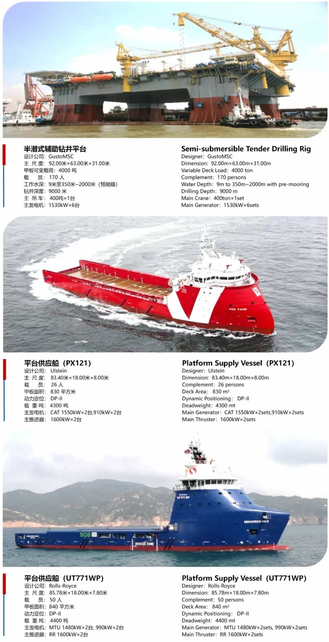 廣東中遠海運重工的船舶修理改裝能力保持在每年300艘左右,修船能力長期位居中國前列;船舶和海工制造產(chǎn)品涵蓋油化船、支線箱船、散貨船、牲畜運輸船、挖泥船、綜合地質(zhì)調(diào)查船、深海原油中轉(zhuǎn)船、半潛輔助鉆井平臺、平臺供應船、三用工作船、應急響應救援船等多品類船舶和海工裝備。