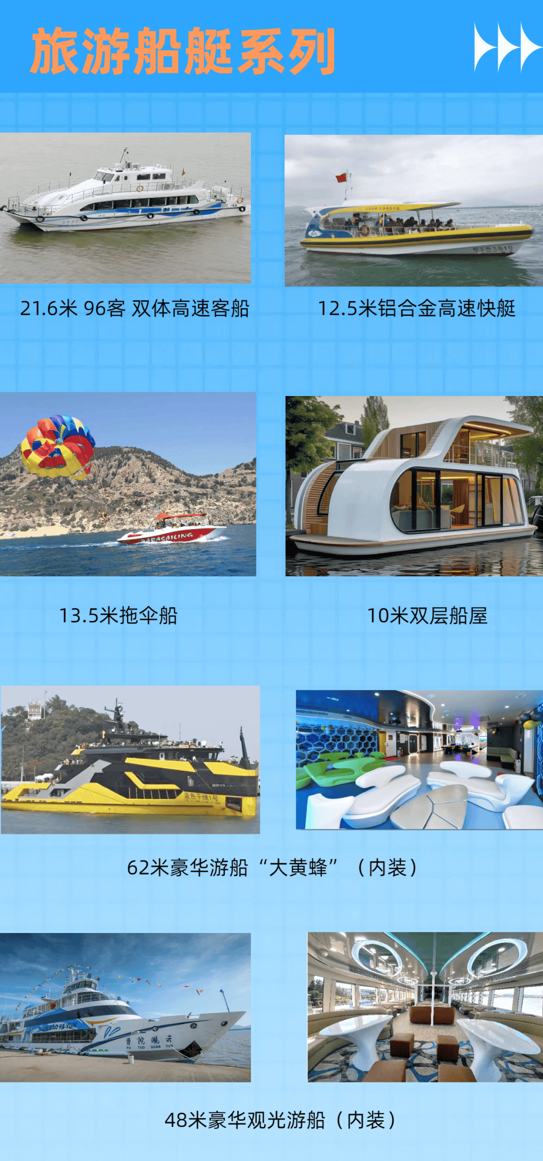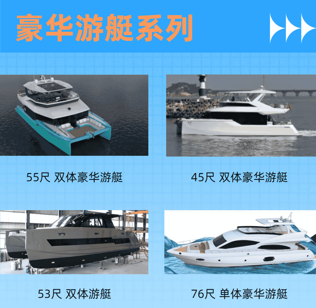公司的船舶產(chǎn)品線分為六個板塊:豪華游艇、休閑釣魚艇、旅游船艇、公務(wù)執(zhí)法船艇、特種工作船艇以及新能源船;可使用多種材質(zhì)建造,包括玻璃鋼、鋼質(zhì)、鋁質(zhì)、碳纖維以及鋼鋁、 鋼玻等多材質(zhì)復(fù)合型的船艇。