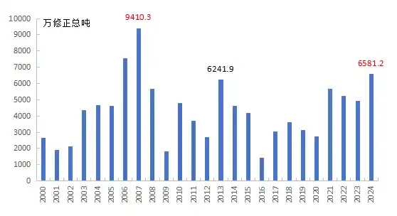 以修正總噸計(jì),2024年全球新船訂單量已超過2013年的6241.9萬(wàn)修正總噸,創(chuàng)2008年以來(lái)的新高。